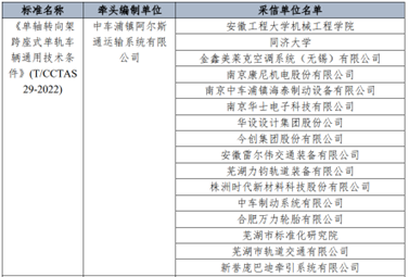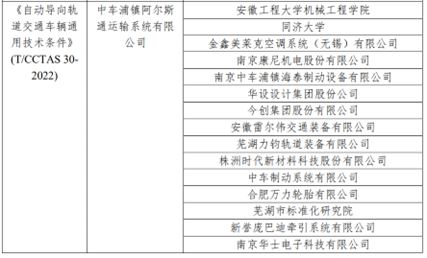 《自動導向軌道交通車輛通用技術條件》(T/CCTAS30-2022),由中國交通運輸協會新技術促進分會提出,聯合中車南京浦鎮車輛有限公司、上海地鐵維護保障有限公司、上海軌道交通八號線三期發展有限公司、上海市隧道工程軌道交通設計研究院、上海申凱公共交通運營管理有限公司、蕪湖市標準化研究院、深圳市機場(集團)有限公司、成都天府國際機場建設指揮部、北京首都國際機場股份有限公司、北京博維航空設施管理有限公司、北京新機場建設指揮部、廣州白云國際機場股份有限公司、深圳市市政設計研究院有限公司、華設設計集團股份有限公司共同起草編制,于2022年6月1日起實施。