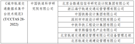 《城市軌道交通數據采集平臺技術規范》(T/CCTAS28-2022)由中國交通運輸協會新技術促進分會提出,中國鐵道科學研究院有限公司牽頭,聯合深圳地鐵建設集團有限公司、武漢地鐵集團有限公司、天津軌道交通運營集團有限公司、重慶市軌道交通(集團)有限公司、南京地鐵運營有限責任公司、北京城建設計發展集團股份有限公司、北京市地鐵運營有限公司、北京軌道交通路網管理有限公司、北京經緯信息技術有限公司、北京卓越信通電子股份有限公司、浙江省軌道交通運營管理集團有限公司、珠海優特電力科技股份有限公司、寧波市軌道交通集團有限公司、寧波工程學院、浙江數智交院科技股份有限公司、中鐵西南科學研究院有限公司、中南大學共同起草編制,于2022年6月1日起實施。