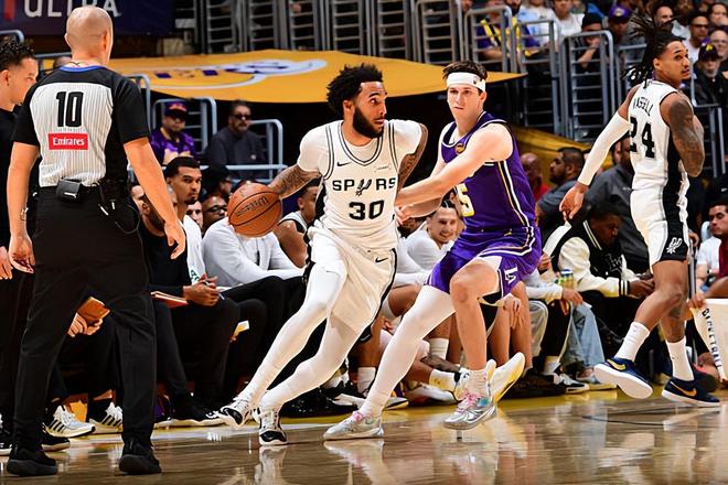 本場比賽中,馬刺的替補鋒線大將朱利安-尚帕尼(Julian Champagnie)依然是保持了自己穩定的表現。尚帕尼全場出場28分44秒,投籃8中6,三分線外4中2,罰球2中2,得到了16分7籃板2助攻1搶斷1蓋帽的數據,還有1次失誤和4次犯規,正負值為+6。尚帕尼在進攻端依然是保持了穩定的輸出,他在對手內線可以制造威脅,他在外線投籃方面也是保持了足夠的穩定性,他也是在進攻端起到了不小的作用。不僅如此,尚帕尼在防守端的表現也是可圈可點的,他也依然是一名非常可靠的防守者,在防守端的作用同樣是有目共睹的。尚帕尼在本場比賽中又一次打出了攻守兼備的表現,他也為球隊的勝利做出了自己的貢獻。
