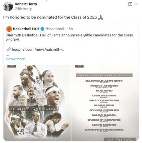其中,七冠成員羅伯特-霍里在列。對(duì)此,他轉(zhuǎn)推評(píng)論道:“我很榮幸能夠提名2025屆奈史密斯名人堂。”