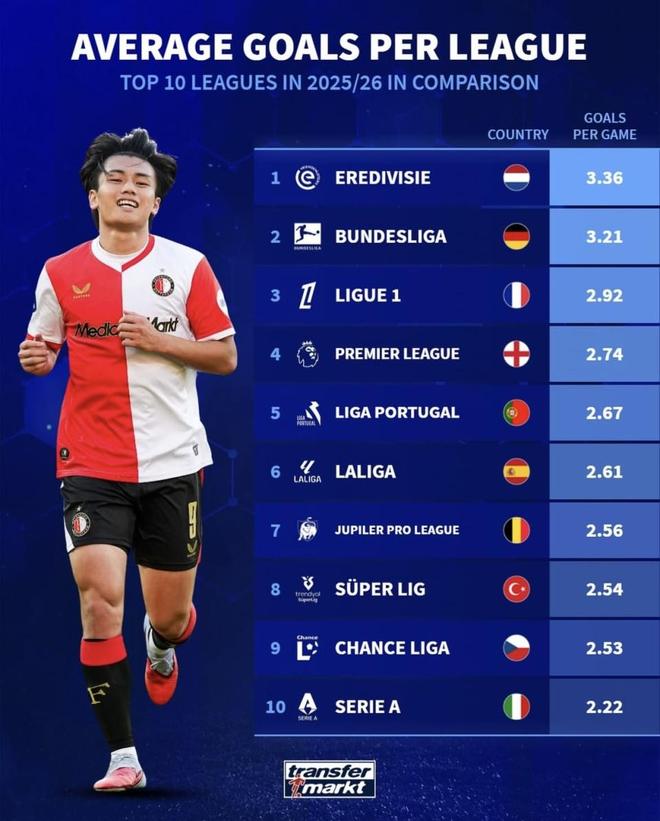 最近德國(guó)轉(zhuǎn)會(huì)市場(chǎng)發(fā)布了2025/26賽季前10大聯(lián)賽場(chǎng)均進(jìn)球榜。荷甲、德甲、英超、西甲、意甲全部在列,場(chǎng)均進(jìn)球差距拉得不小。荷甲單場(chǎng)3.36球火力全開(kāi),意甲只有2.22球被不少球迷吐槽“太保守”,到底哪個(gè)聯(lián)賽更好看?再把各聯(lián)賽的成立時(shí)間和球隊(duì)數(shù)量放在一起看,這份榜單背后的味道就更有意思了。